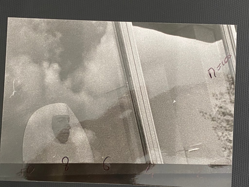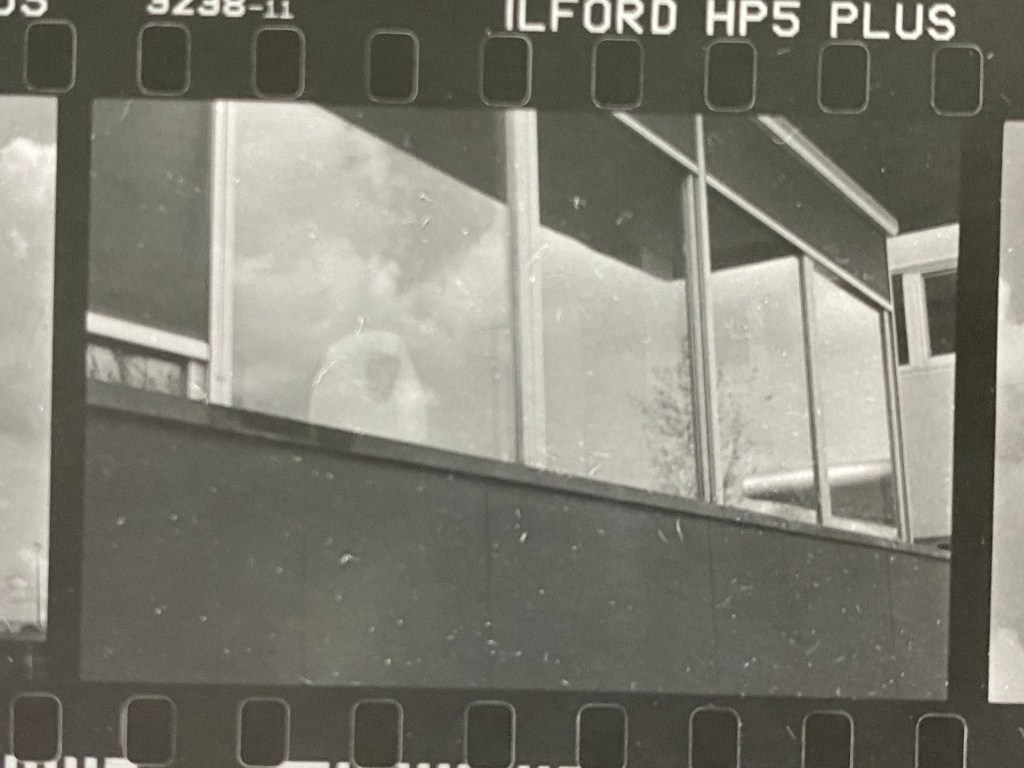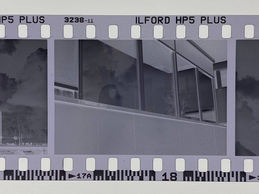 Comunque veniamo alla sostanza del post: come potete vedere dal negativo nella foto successiva anche qui l’esposizione risulta un peletto giù e anche il contrasto tra la zona più densa (quella centrale della finestra che riflette le nuvole) e il resto non è elevatissima. Anche il provino a contatto risulta scuro (anche se dalla foto non sembra), e comunque sembra essere molto simile a quello della foto del mercato coperto dell’episodio 2, quindi decido di partire subito con un contrasto simile all’altro scatto.